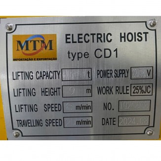 Talha Elétrica 1 Tonelada Fixa - Cabo de Aço 9 Metros - 220/380v, Sem Troller - TALH1FM